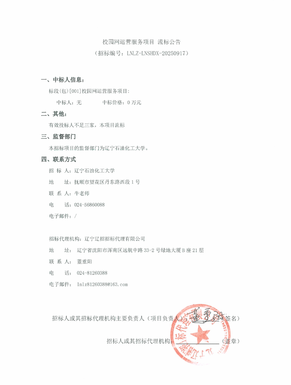 校园网运营服务项目流标公告(招标编号:LNLZ-LNSHDX-20250917)